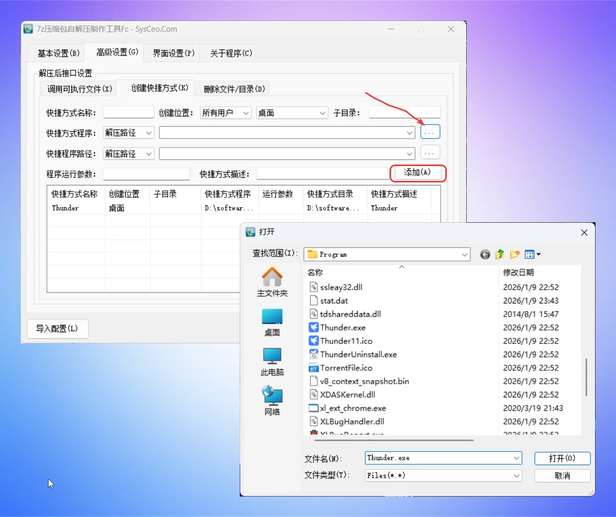 导入快捷方式程序后会自动加载快捷方式名称,你也可以自定义改动,然后点击添加