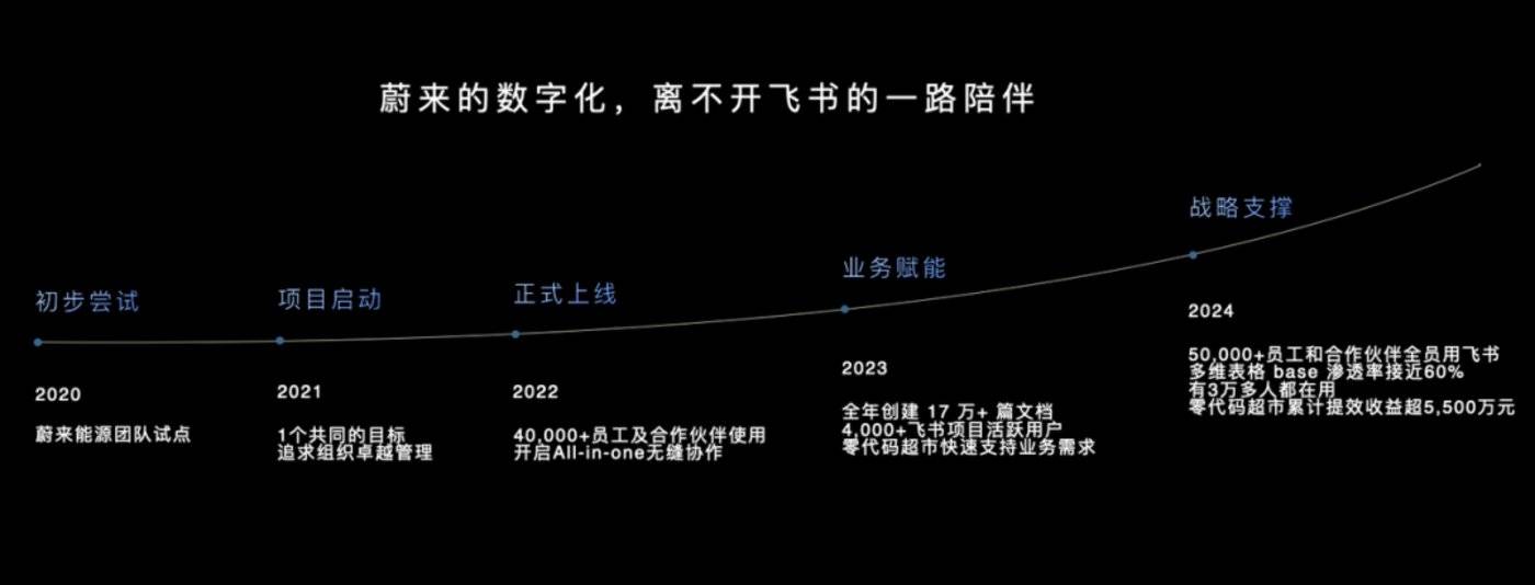 「要实现油车去的地方,电车都能去。」 李斌说。为了完成这样庞大又复杂的项目,从 2020 年蔚来充换电团队开始试点飞书,到 21 年开始设定共同的目标,到 22 年开始 all in one 用飞书,到现在蔚来上万多员工加上 2 万多合作伙伴的员工都在全员用飞书多维表格,渗透率接近 60%。零代码超市替蔚来省了 5, 500 万。