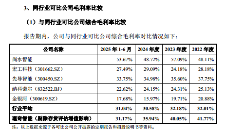 与亮眼业绩形成鲜明反差的是,公司产品竞争力呈现持续下滑态势,核心体现为毛利率的逐年走低。报告期内,剔除存货评估增值影响后,理奇智能的毛利率分别为 41.77%、40.05%、35.94%、31.17%,呈持续下滑趋势,2025 年上半年较 2022 年累计下滑 10.6 个百分点;不过值得注意的是,同期同行可比公司毛利率平均值分别为 32.01%、32.18%、30.58%、31.05%,理奇智能的毛利率虽持续走低,但始终高于行业均值,2025 年上半年仍略超同行均值 0.12 个百分点。