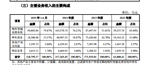 其中 2022 年-2024 年和 2025 年 1-6 月 (下称“ 报告期”) 物料智能处理系统产生的销售收入分别为 39337.76 万元、87697.91 万元、165578.74 万元、94883.86 万元,分别占当期主营业务收入的 63.64%、51.01%、76.21%、79.87%,营收占比持续提升并接近 8 成,成为业绩增长的核心驱动力。