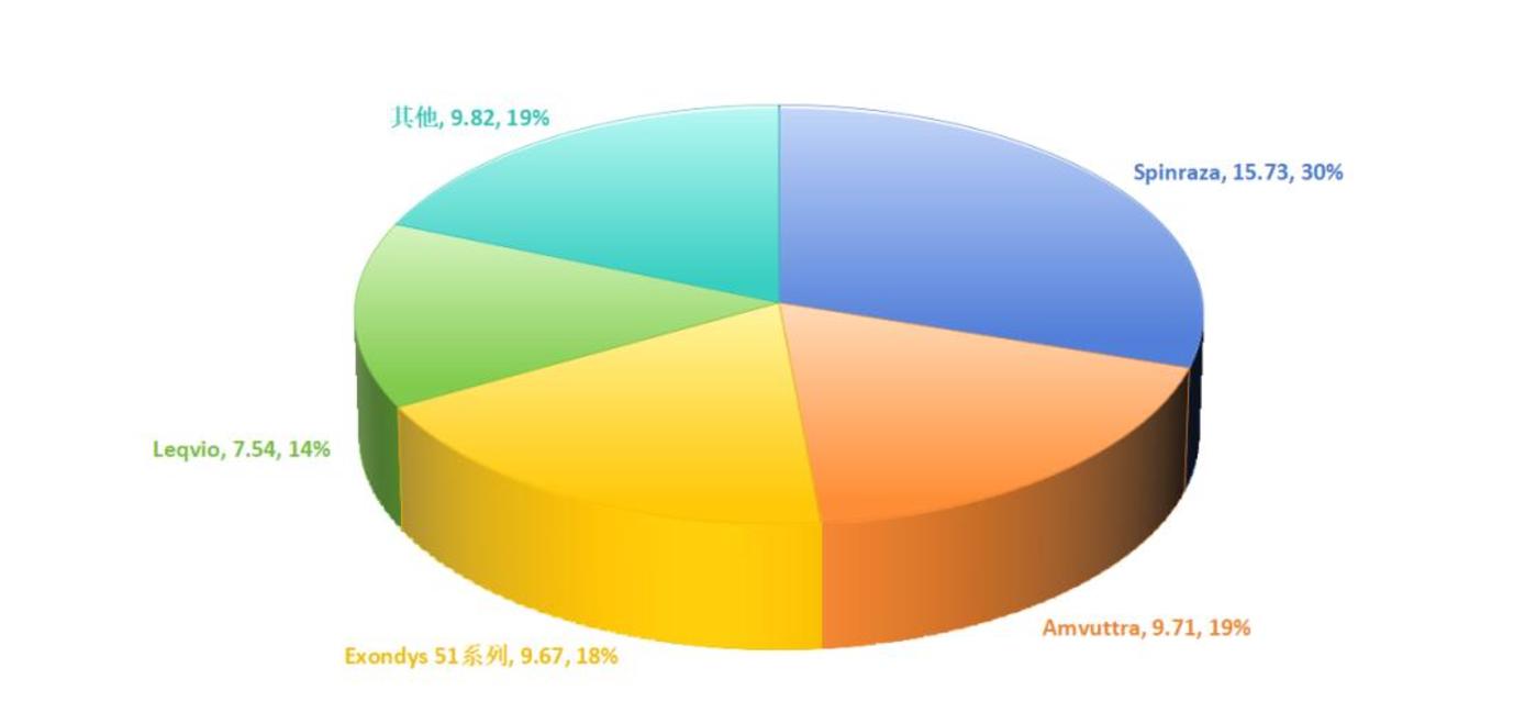 从市场份额来看,2024 年全球小核酸药物销售额达 52.47 亿美元,其中 Ionis 与 Biogen 合作的 Spinraza(诺西那生钠) 以 15.73 亿美元销售额占比 30%,Alnylam 的 Amvuttra(Vutrisiran) 以 9.71 亿美元占比 19%,Sarepta 治疗杜氏肌营养不良症 (DMD) 的系列药物销售 9.67 亿美元,占总销售额的 18%。