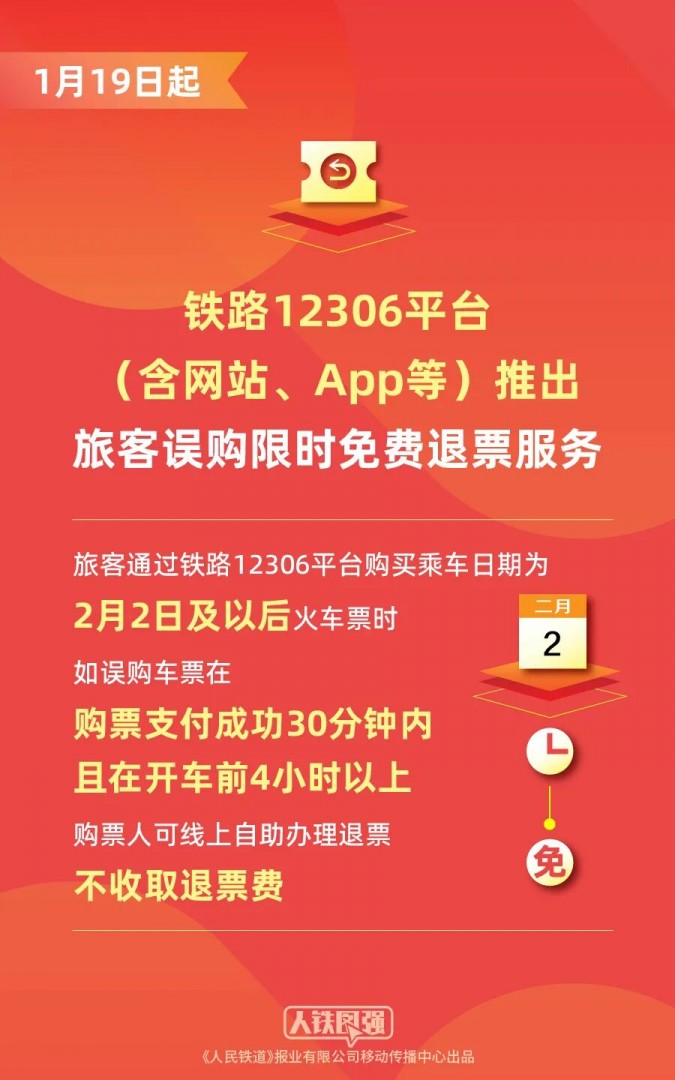 据 「中国铁路」 微信公众号消息,1 月 19 日起,铁路 12306 平台 (含网站、App 等,下同) 推出旅客误购限时免费退票服务。