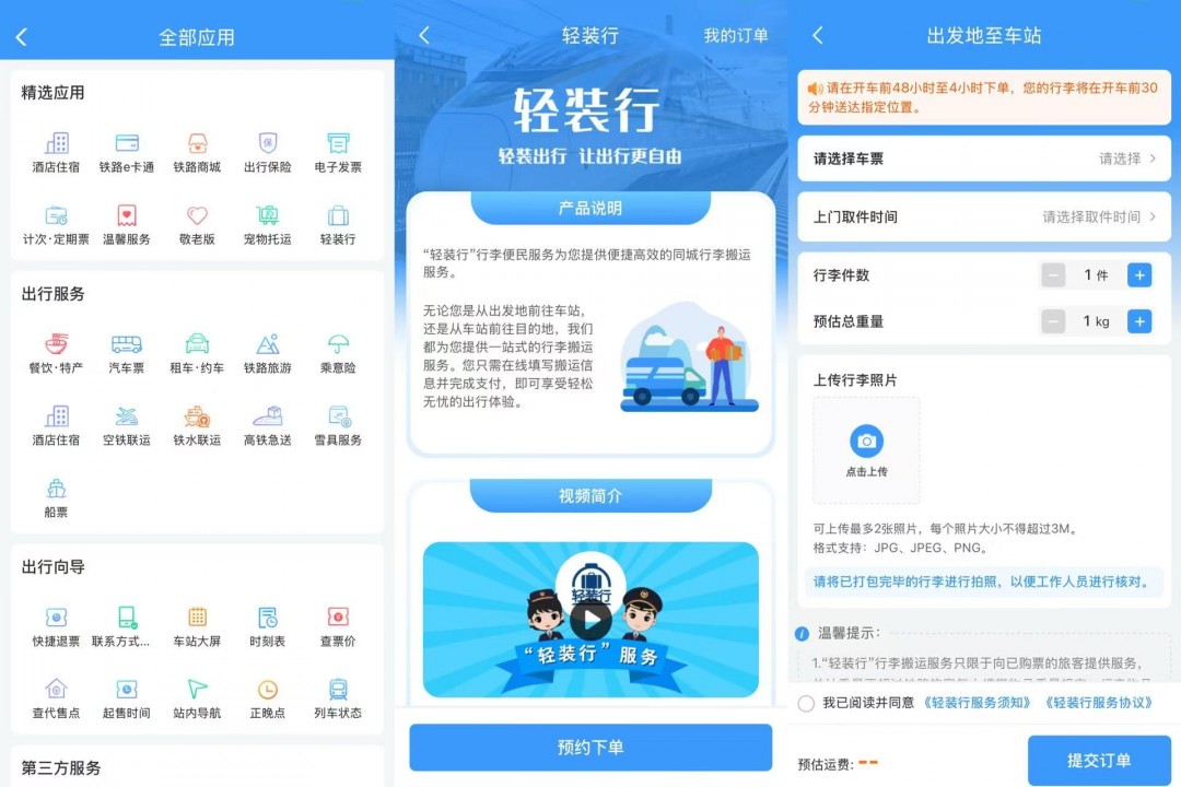 「轻装行」 是铁路部门为旅客出行提供的 「门到站」「站到门」 同城行李搬运服务。在同城距离车站 35 公里内,旅客根据实际需要可选择以下两种 「轻装行」 服务: