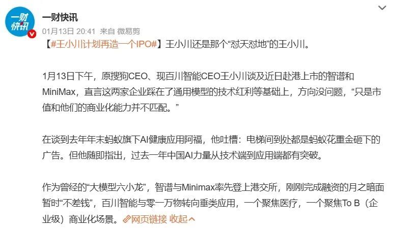 王小川在发布会上也评价了智谱和 MiniMax 在资本市场的表现,他认为,智谱和 MiniMax 主要还是踩在通用模型技术红利和政策支持的基础上,但目前这两家公司的市值和商业化能力并不匹配。