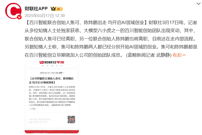 早在 2024 年,王小川就曾表示百川智能的业务重心将转向医疗领域。2025 年初,百川智能将 B 端组的 PE(提示词工程) 团队调整至产研组,裁撤了主要负责金融行业 ToB 业务的 B 端组。随后,公司的联合创始人陆续出走,只剩下茹立云管理医疗 To B 团队,这也被外界视为百川智能要坚定押注 AI 医疗赛道的信号。