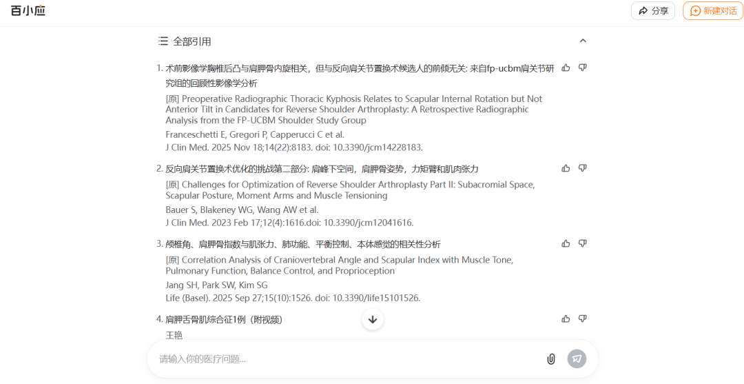 百小应的“ 医生版”,与号称美国医生版 ChatGPT 的“OpenEvidence” 十分相似,都强调循证医学和证据溯源,辅助医生做临床决策,能帮医生梳理治疗方案、分析科研文献等,而且保证引用的文献都是真实存在的。