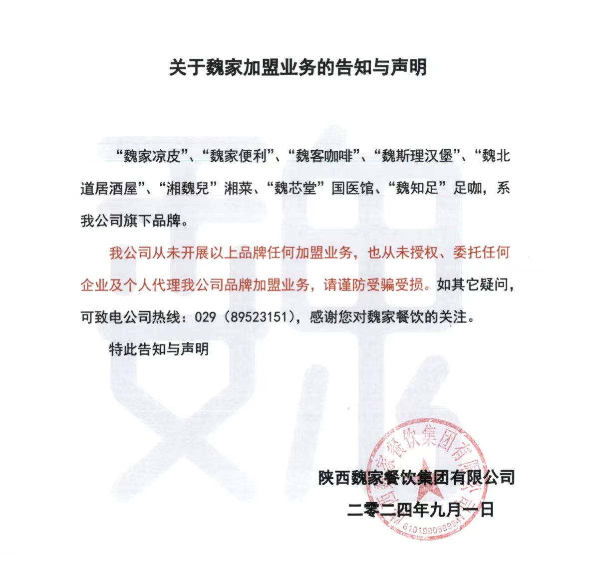 而从魏家对于加盟店态度来看,总部似乎要与“ 历史遗留问题” 划清界限。其官网发布的 《关于魏家加盟业务的告知与声明》 中写道:我公司从未开展任何加盟业务,也从未授权、委托任何企业及个人代理我公司品牌加盟业务。