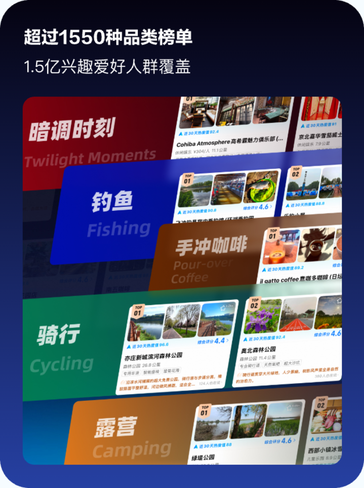 具体统计方法是,高德基于 10 亿用户日均 2.9 亿的行为序列,生成全球首创的基于季节与地域特征自动演化的生活服务榜单,如在冬天提供滑雪场榜单,春天提供踏青榜单,夏天避暑榜单,秋天赏红叶榜单等等。