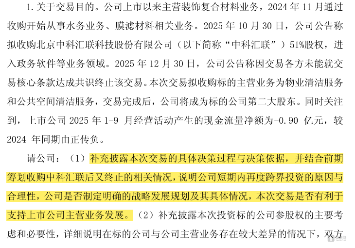 三个月内两次切换赛道,从装饰材料到水务、政务软件再到清洁服务,华立股份的战略规划呈现明显的“ 漂移特质”。上交所在问询函中直接质疑其“ 短期内再度跨界投资的原因与合理性”,要求说明是否制定明确的战略发展规划。