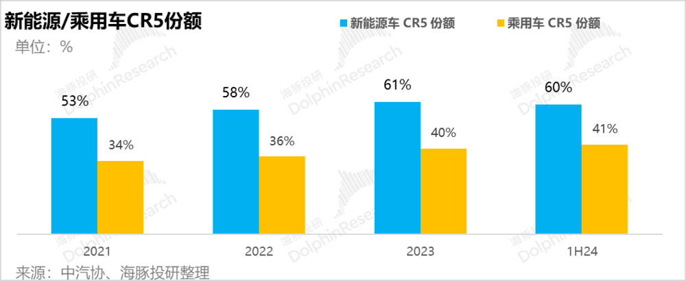 但也是到了 2024 年,跨界型选手开始正式释放产能,中国新能源车牌桌的选手才算坐齐,也因为实力型选手才刚上牌桌,所以新能源车大能们打了两年的价格战之后,市占率没有集中反而下行: