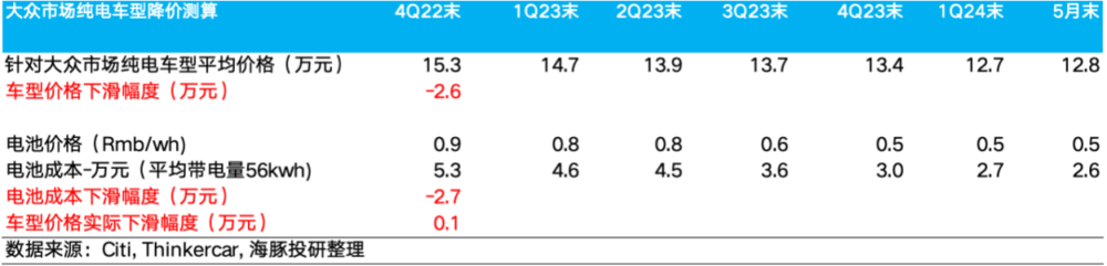 这也就意味着,2023 年到 2024 年 5 月,针对大众市场的纯电车型终端的降价基本都是靠电池端的降本来实现的。