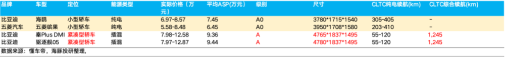 前两个因素合起来也导致了,从需求端来看,在同一价格段上,纯电车型无论是在综合续航上,还是在空间上 (由于纯电电池成本高,价格带难以继续下沉,导致纯电 A0 级车型和混动 A-B 级车型处于统一价格带),都大幅低于已经把价格带下沉到 5 万~15 万元的混动车型。