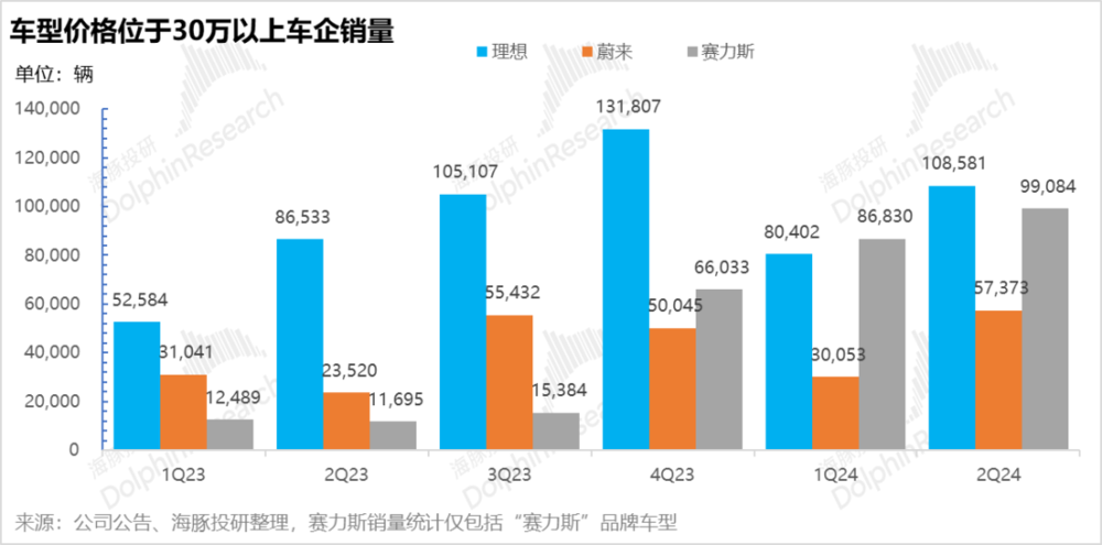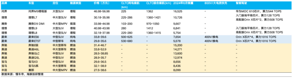 也因为存在一个品牌认知的软门槛,该价格端站稳的插混品牌也仅问界,理想,腾势 D9,格局相对稳定。而高端纯电随着品牌和车型的下沉,目前仅剩蔚来一家,竞争相比 20 万~30 万元价格带激烈程度降低。