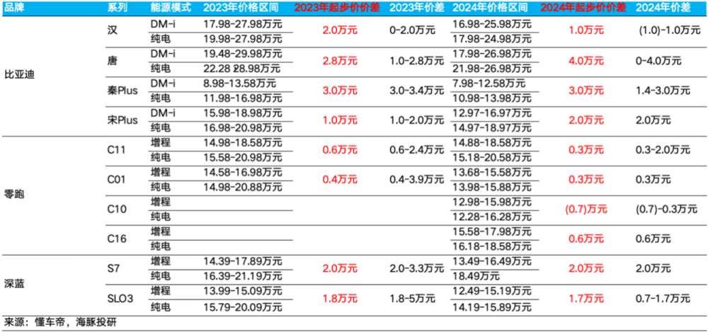 从消费者更在意的起步价来看,我们以混动王者比亚迪为例,比亚迪车型的混动和纯电车型的起步价差从去年的 1 万~3 万元扩大到了 2024 年的 1 万~4 万元,其中 2024 年混动最畅销的秦 plus Dmi 起步价差达到了 3 万元!