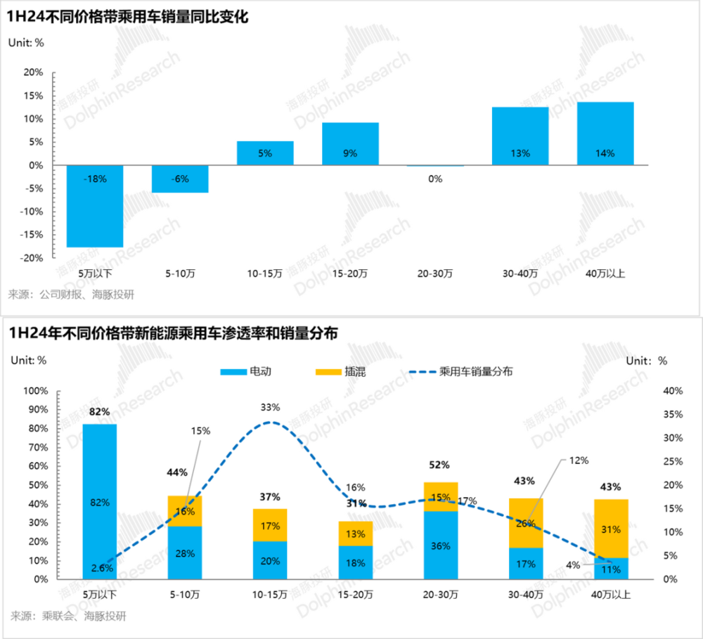如果小结第四部分的结构性投资机会,在 10 万~15 万渗透率攻坚机会上,重点关注比亚迪的机会,而在 30 万以上价格带上,海豚君更关注的是极限估值+品牌/价格带下沉带来的反转机会。