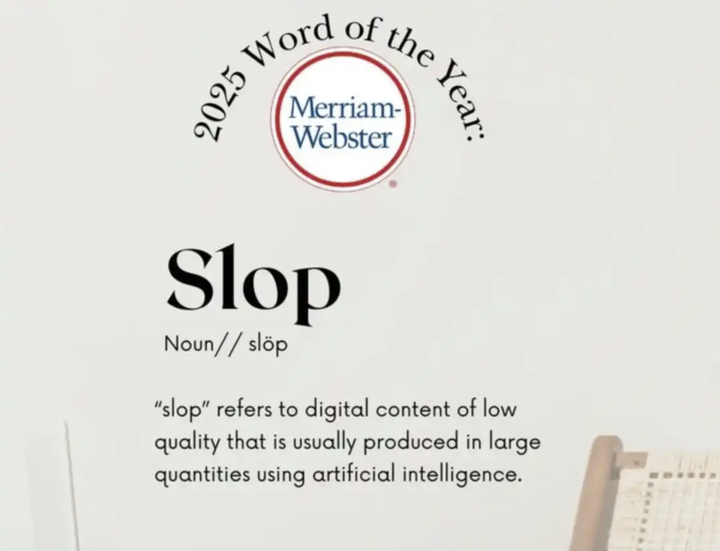就在前几天,「Slop」 被 《韦氏词典》 列入 2025 年度热词,被定义为 「通常由人工智能 (AI) 批量生成的低质量数字内容」。据专家溯源,「Slop」 在 18 世纪时意为 「软泥」,19 世纪时指代 「食物残渣」,后引申为 「垃圾」「几乎没有价值的产品」,中文则译为 「泔水」「脏水」。