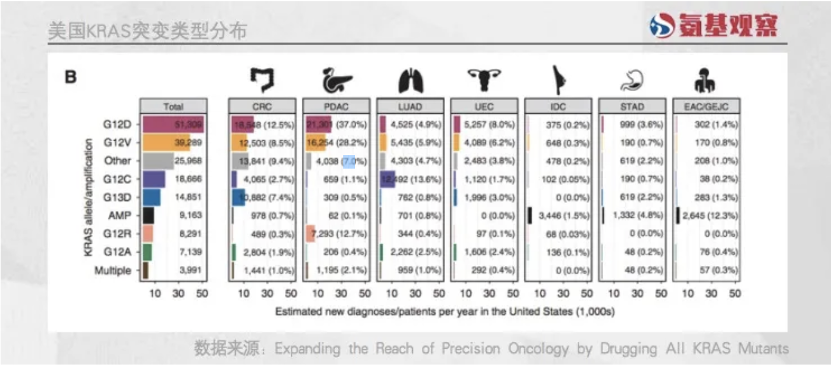 极度分裂的情况下,KRAS 靶点细分子集的患者群体规模并不大。以美国市场为例。如下图所示,虽然美国每年新发肿瘤患者中,KRAS 突变患者数量超过 10 万人。但占比最高的 G12D 突变,新发患者人数不过 5.1 万人,而像 G12V、G12C 等则是更少。