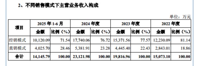 更为值得关注的是,公司经销商群体存在大规模变动的情况,2022 年-2024 年,新增经销商数量分别为 126 家、121 家、103 家,而退出经销商数量则达到 156 家、127 家、194 家,退出占比分别为 40.94%、33.87%、68.31%,且退出数量始终多于新增数量,导致公司经销商总数从 381 家持续下滑至 284 家。这种高频次、大规模的经销商变动,引发了市场对其经销渠道稳定性的担忧,担心可能影响区域市场覆盖、终端维护以及产品销售的连续性等。