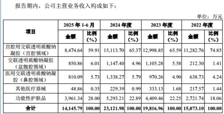 其中宫腔用交联透明质酸钠凝胶 (宫腔领域) 产生的销售收入分别为 11282.76 万元、12998.85 万元、15113.7 万元、8474.64 万元,分别占当期主营业务收入的 74.85%、65.59%、65.37%、59.91%,占比始终在 6 成以上徘徊,产品结构单一化特征显著。
