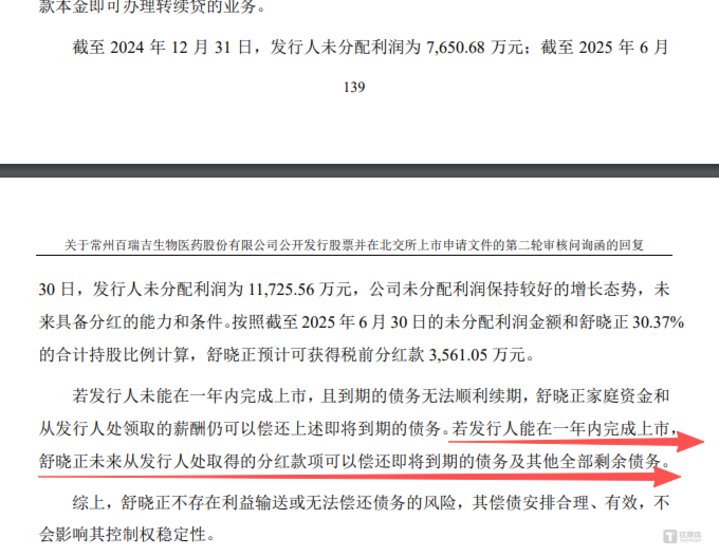 对此百瑞吉在问询函中表示,若公司未能在一年内完成上市且到期债务无法顺利续期,舒晓正可通过家庭资金及从公司领取的薪酬偿还即将到期债务;若公司顺利实现年内上市,舒晓正未来从公司取得的分红款项,即可覆盖即将到期债务及全部剩余债务。