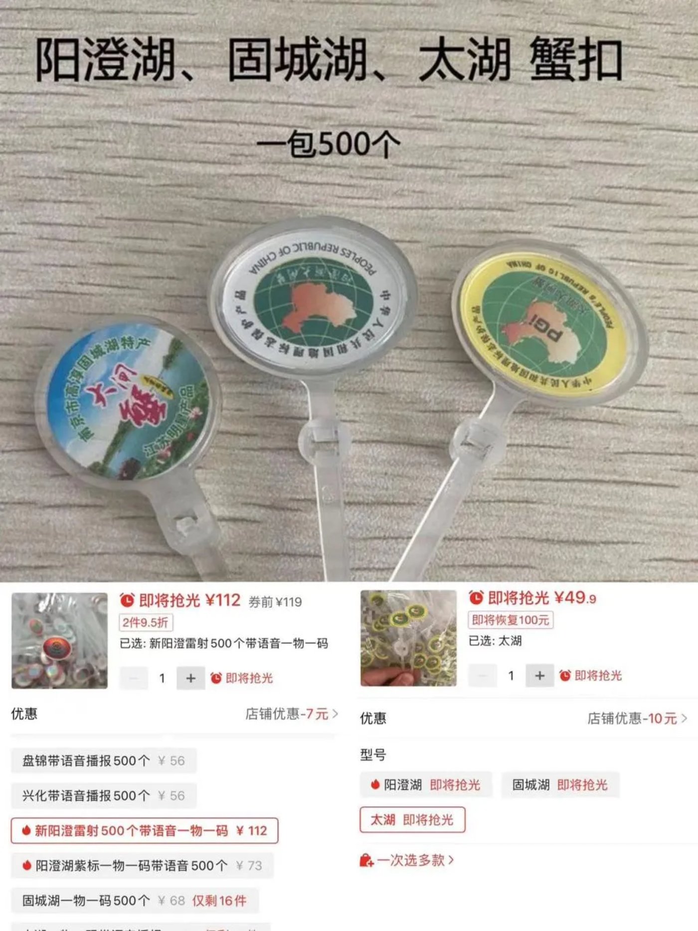 随后锌刻度也在电商平台上搜索发现,阳澄湖、太湖、固城湖的大闸蟹蟹扣都在明码标价地售卖,普通版本均价 49.9 元/500 个,新版带镭射和语音的蟹扣 112 元/500 个。