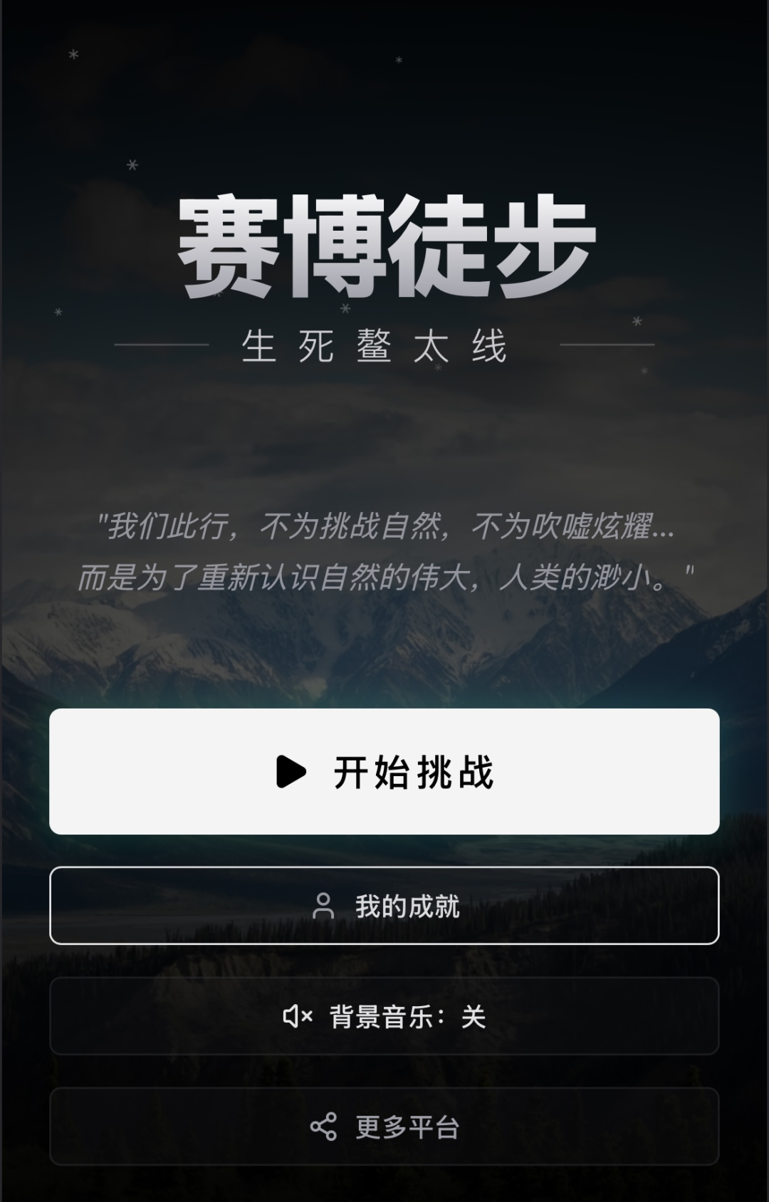 在小程序游戏的首页,是驴友之家门口的经典语录:「我们此行,不为挑战自然,不为吹嘘炫耀,而是为了重新认识自然的伟大,人类的渺小。」
