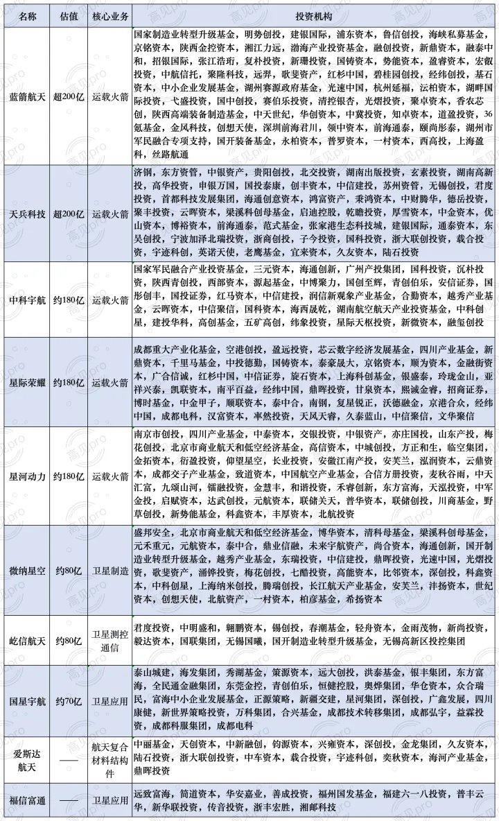 截至目前,商业航天领域推进 IPO 进程的代表性公司的估值、核心业务,以及投资人 (据不完全统计) 详情如下: