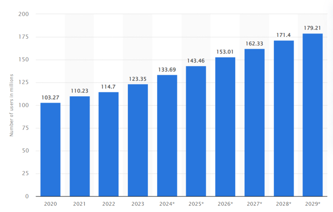 Statista 发布的数据显示,预计到 2029 年,巴西社交媒体用户将达到 1.79 亿, 2029 年,该国社交媒体用户数量将达到新的峰值。
