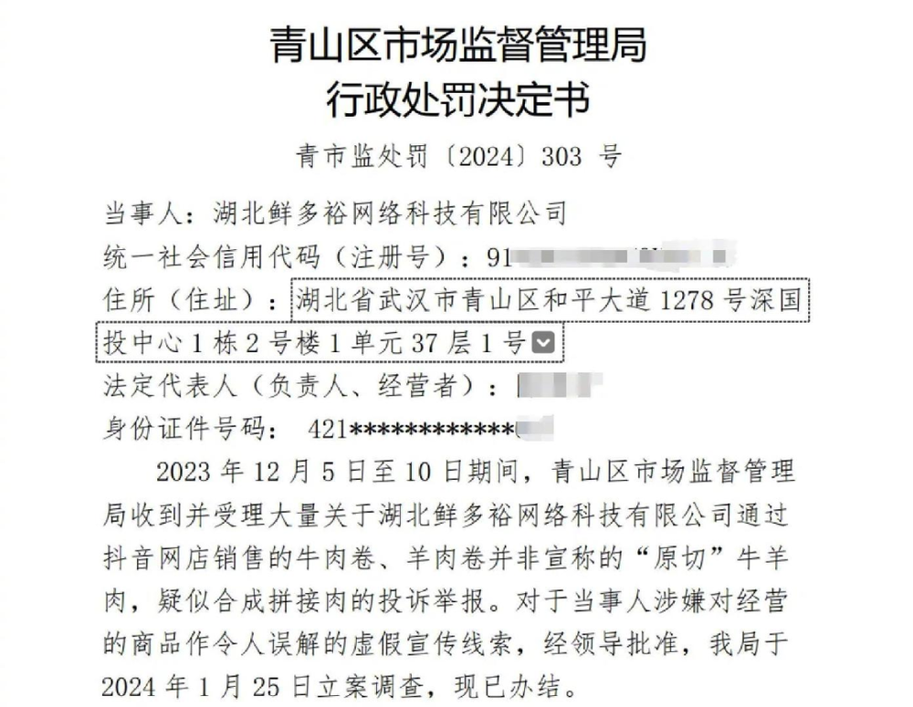 青山区的市场监督管理局对此回应说,这家牛肉的生产商,确实已经被罚了 50 万。