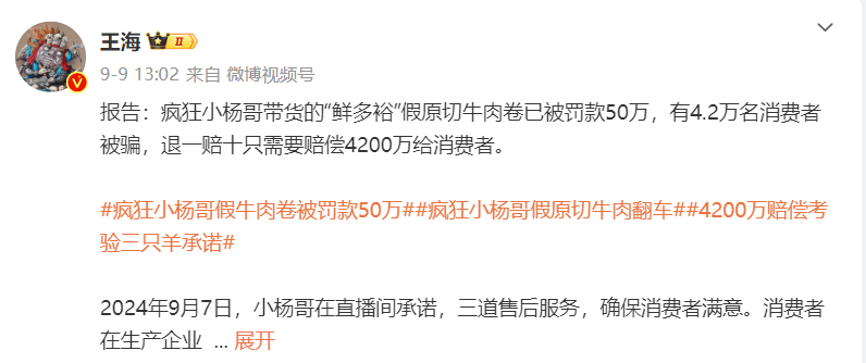 这边因为糟头肉吵得火热,另一边 9 月 9 号的时候,知名打假人王海又在微博上补刀小杨哥。