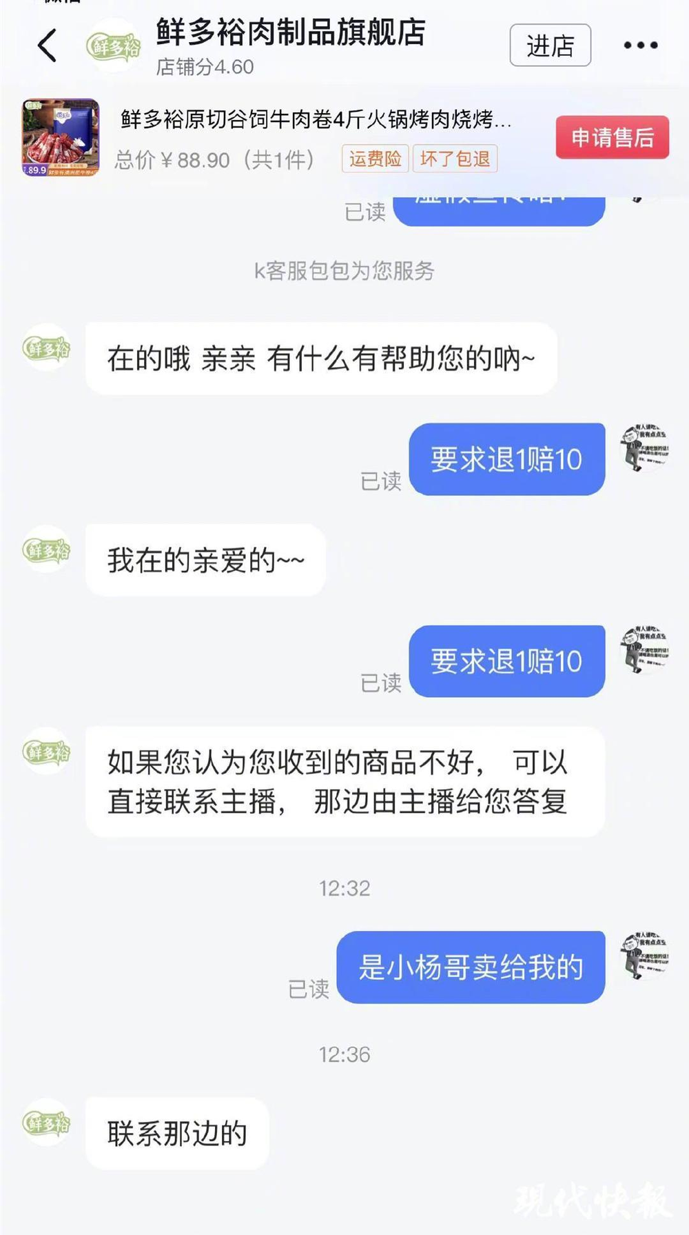 说他带货的 「鲜多裕」 牛肉卷被认定不是原切牛肉,已经有 4.2 万名消费者被骗,让小杨哥赶紧出来退一赔十,准备好 4200 万吧。