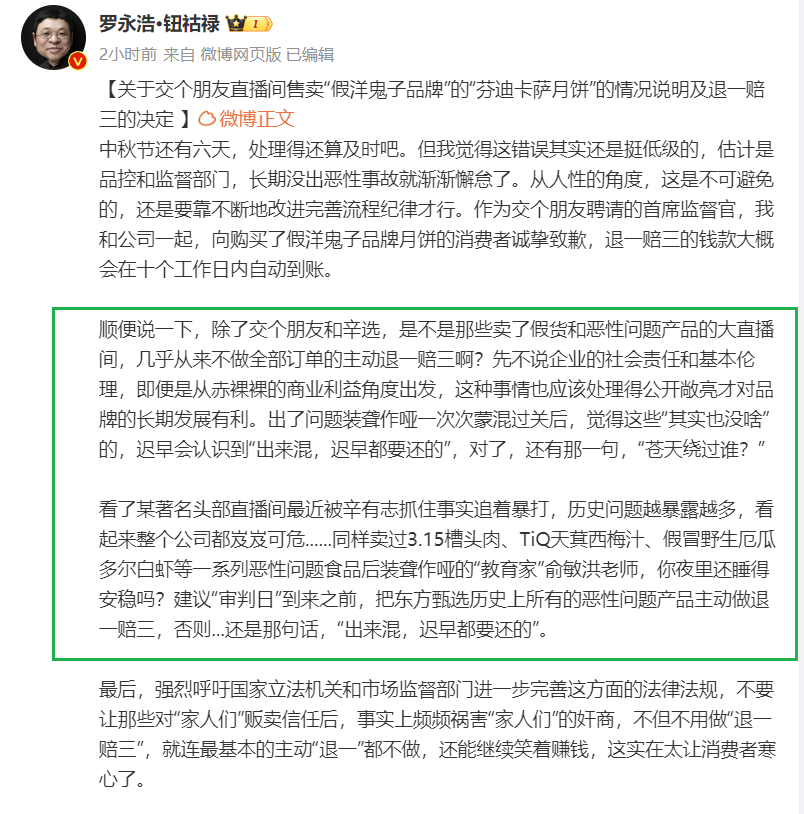 就像罗永浩在微博里说的,嘴上喊着 「家人们」,最后别说假一赔十,有些人连赔一可能都做不到。转头还能笑着来赚家人的钱。