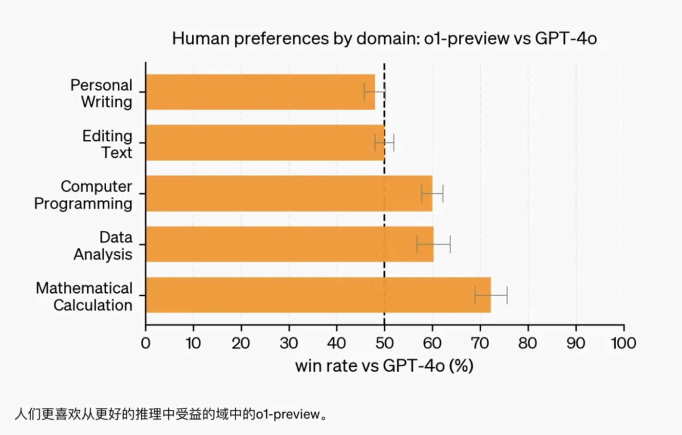 结果显示,在需要大量推理的任务上,比如数据分析、编程和数学问题,大家更喜欢 o1-preview。因为 o1-preview 经过特殊的强化学习训练,所以,在解决这类问题时,推理能力更强,更高效。