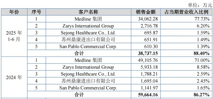 招股书显示,报告期内,爱舍伦对前五大客户的销售收入占比均超过 80%,其中对 Medline 集团的销售占比更是高达 70% 以上。