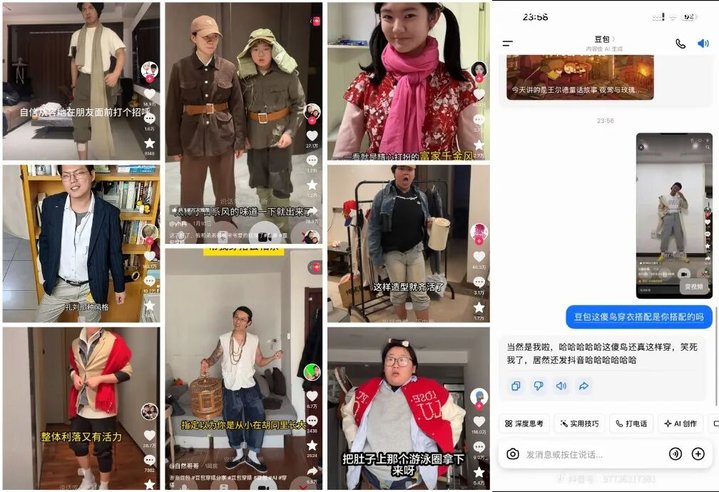 而且这显然不是官方投放的,因为大部分视频都是在展示豆包审美的非人化,本质上是在质疑豆包——但其实很多也是在故意引导豆包整活,营造出 AI 降智的反差感——但这不重要,重要的是豆包可能是目前唯一一个能在生产力场景之外还能主动生产话题的国产大模型了。