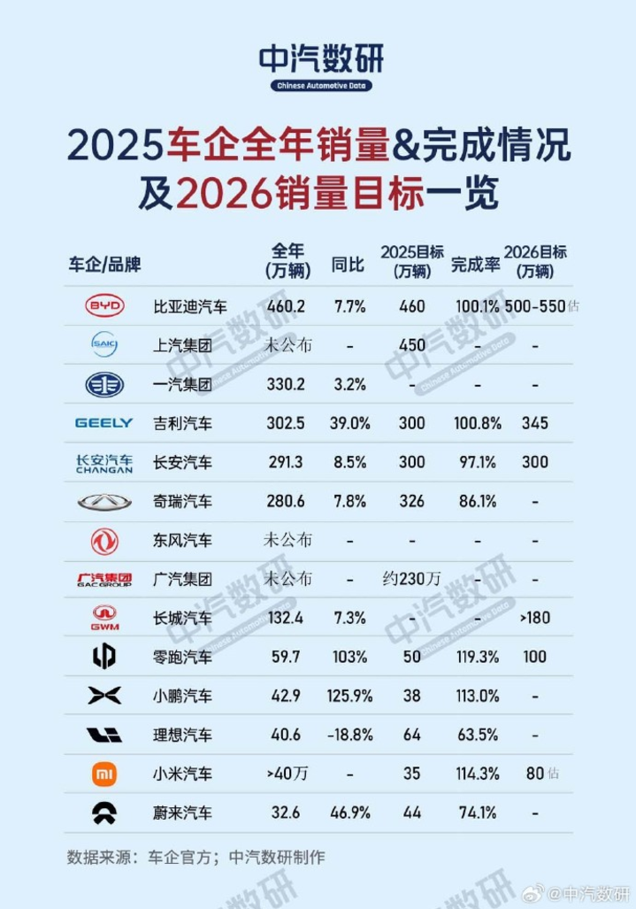 2025 年的销量榜单,是行业格局重塑最直观的晴雨表。在中汽数研的一份 2025 年车企销量排名中,比亚迪以 460.2 万辆的绝对优势登顶,上汽、一汽分列二三位,而蔚来在该榜单中以 32.6 万辆位居末位。