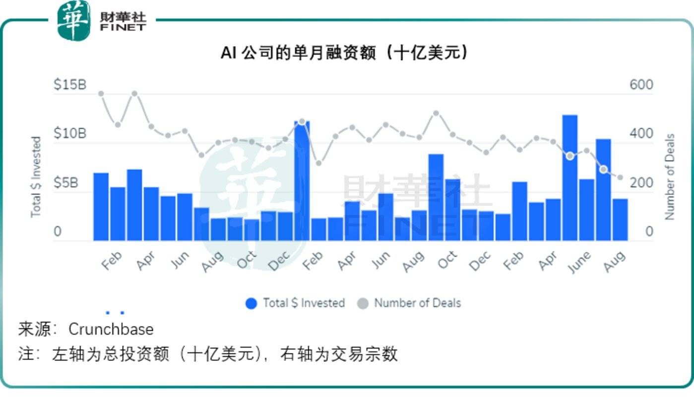 尽管风投融资规模显著缩小,但是 AI 依然是主要的 「吸金」 领域,就 8 月而言,有 43 亿美元的资金流向 AI 相关初创公司,占了当月总融资额的 24%,抛离第二大投资领域保健和生物科技的融资规模 35 亿美元。