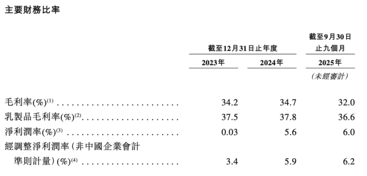 盈利能力方面,君乐宝的经调整净利润从 2023 年的 6.0 亿元增至 2024 年的 11.6 亿元,2025 年前三季度为 9.4 亿元;经调整净利润率从 2023 年的 3.4% 提升至 2024 年的 5.9%,2025 年前三季度进一步增至 6.2%,增长叠加赚钱能力是港股偏爱的结尾,也是当前乳业最稀缺的能力。