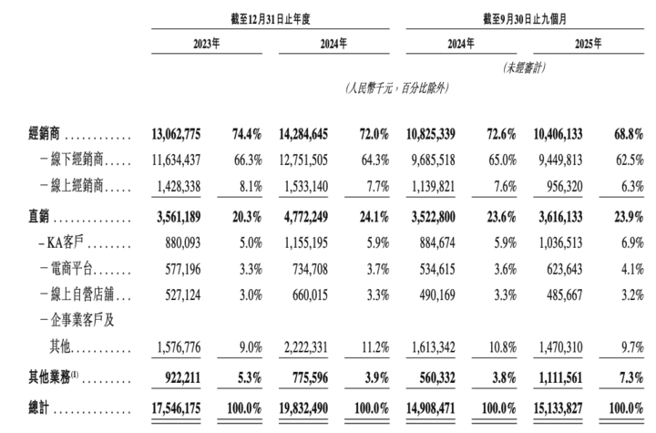2025 年前三季度,经销商渠道仍贡献了约 68.8% 的收入,直销渠道 (含 KA、电商、自营店) 则为 23.9%。