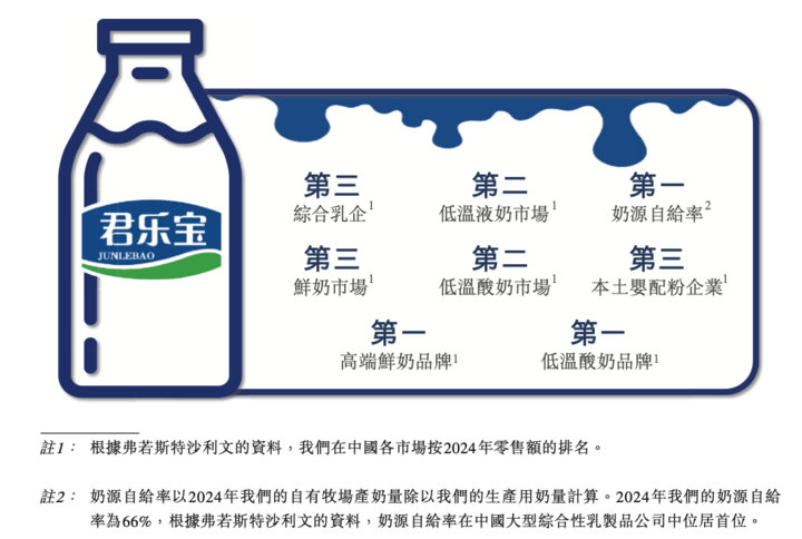 在招股书中,君乐宝引用弗若斯特沙利文 (Frost & Sullivan) 数据,按 2024 年中国市场零售额计,君乐宝在中国综合性乳制品企业中排名第三,市场份额为 4.3%。