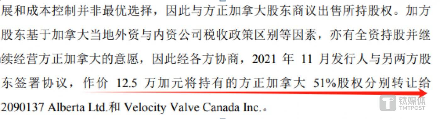 在拿回方正加拿大控制权三至四年后,即 2021 年 11 月,方正阀门以 12.5 万加元的价格将方正加拿大的股权分别转让给了 2090137 Alberta Ltd. 和 Velocity Valve Canada Inc.。