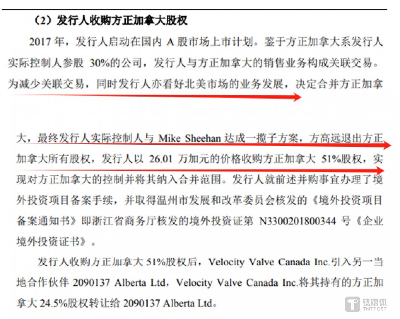 2017 年,由于方正阀门启动 A 股市场上市计划,为了减少关联交易以及看好北美市场的业务发展等因素,方高远退出方正加拿大所有股权,而方正阀门以 26.01 万加元收购方正加拿大 51% 的股权。