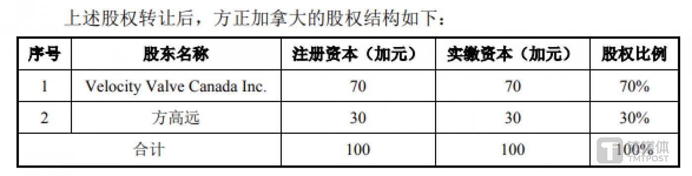 方正加拿大成立于 2012 年,由方存正出资设立。2016 年 9 月,方存正将方正加拿大 70% 的股权转让给了 Velocity Valve Canada Inc.,同时方存正将方正加拿大 30% 的股权转让给了方高远,彼时方正加拿大的股权架构如下: