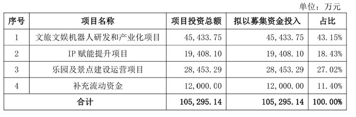 本次定增预案的资金分配,清晰勾勒出金马游乐的转型路径。募集资金扣除发行费用后,将重点投向四大方向:文旅文娱机器人研发和产业化项目拟投入 4.54 亿元,占募资总额的 43.1%,成为绝对核心;乐园及景点建设运营项目、IP 赋能提升项目分别规划 2.85 亿元、1.94 亿元,剩余 1.2 亿元用于补充流动资金。