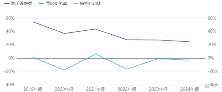 业绩剧烈波动的核心,在于占营收超 90% 的核心主业游乐装备制造业务盈利能力持续下滑。该业务的毛利率从 2019 年的 55.22% 降至 2024 年的 31.13%,累计下滑超过 20 个百分点。