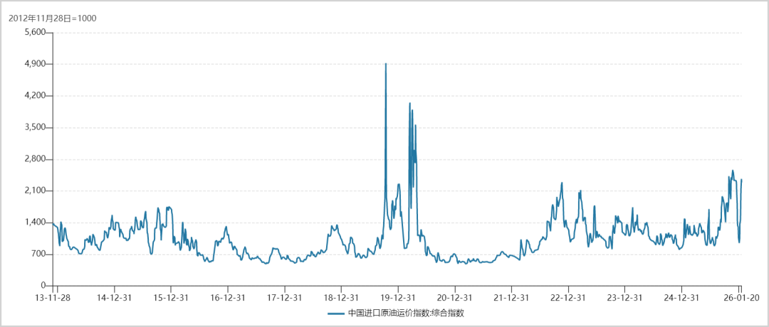 2025 年 7 月底,中国进口原油运价指数触及 880 点的多年低位,随后市场呈现出“ 淡季不淡” 的特征,并在传统旺季的四季度创下 5 年新高。此后虽有一定波折,但最新运价依然维持在相对高位。