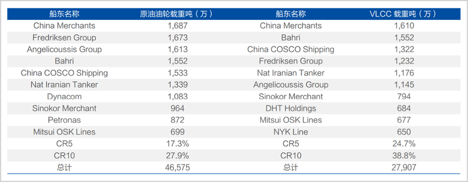 据克拉克森最新数据,按 VLCC 载重吨计算,招商轮船、中远海能分别以 1610 万吨和 1322 万吨位列全球第一、第三,前十家公司市场占有率合计已接近 40%。