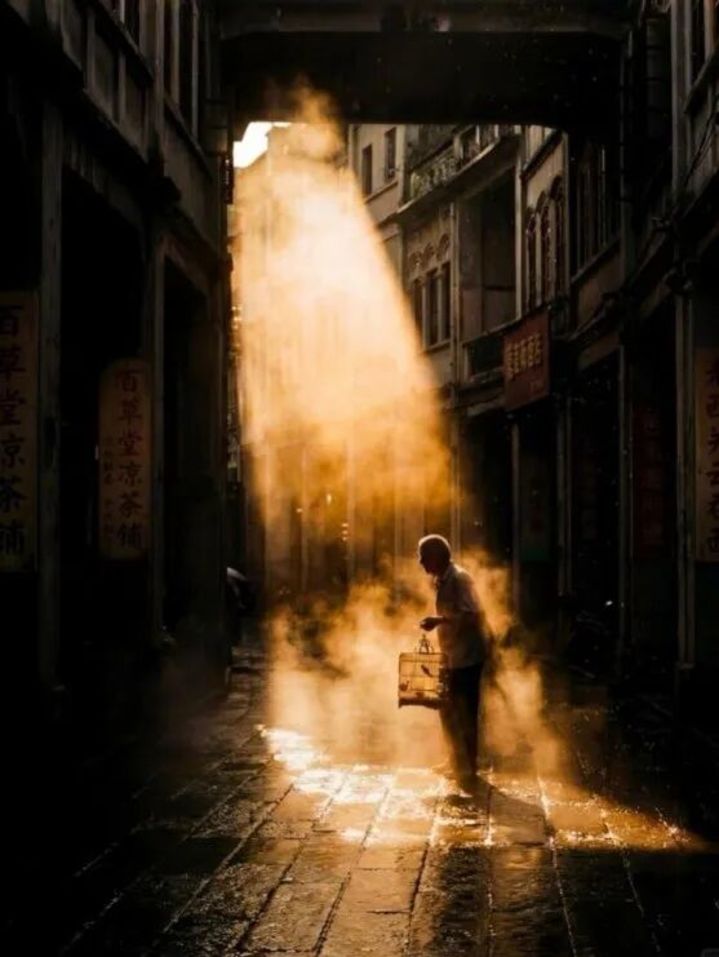 结果公示初期,大家都被这张老照片特有的质感打动了。暖黄色的色调营造出怀旧的氛围、构图稳重,楼房阴影处泄露的光线在老旧的建筑上切割出丰富的光影层次,前景的老人提着鸟笼,似乎正在诉说着老街的闲适。