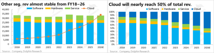 b. 云业务是近几年来公司唯一的收入增长来源,且在 26 财年将贡献过半的公司总收入,成为公司体量最大且增速最快的核心业务板块。