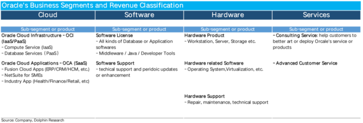a. 云业务:当前最重要的业务板块,可进一步细分为 IaaS 类的 OCI 和 SaaS 类的 OCA 两条业务线。